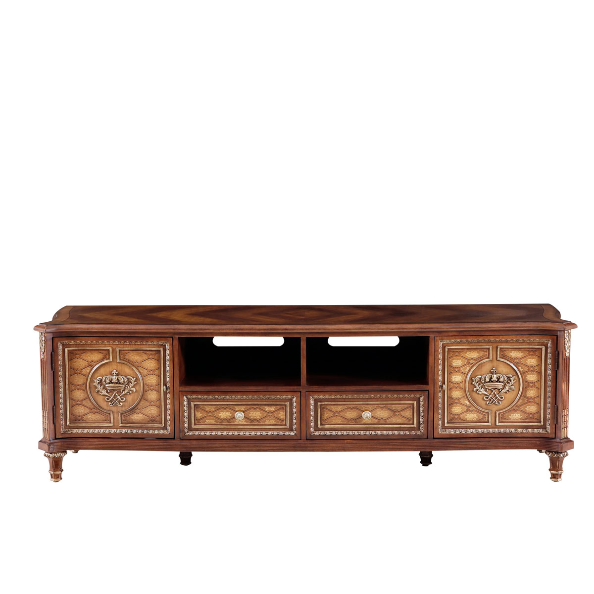 凡尔赛玫瑰电视柜 以 Louis路易时期 Bombe Chest(邦贝柜)新古典风格为设计灵感,多种珍稀木皮贴饰成的木皮拼花清晰美观,斗面镶嵌路易十四太阳王的“L”字图腾雕刻,沐浴着太阳之光象征王权荣耀,