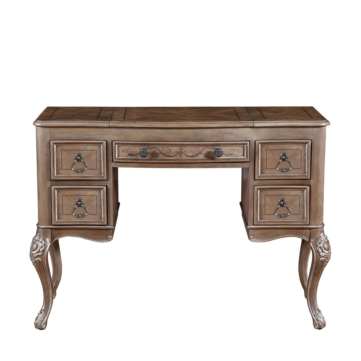 * 四个储物抽斗,底部采用硬木实木滑轨.中间抽斗的设计可翻下斗面,用来放置键盘,抽斗内侧有电线孔,抽斗两边装有两条三节消声铁滑轨,滑顺耐用; * 中间面板可打开,里面有镜子和绒布戒指格; * 脚底部装有可调脚钉