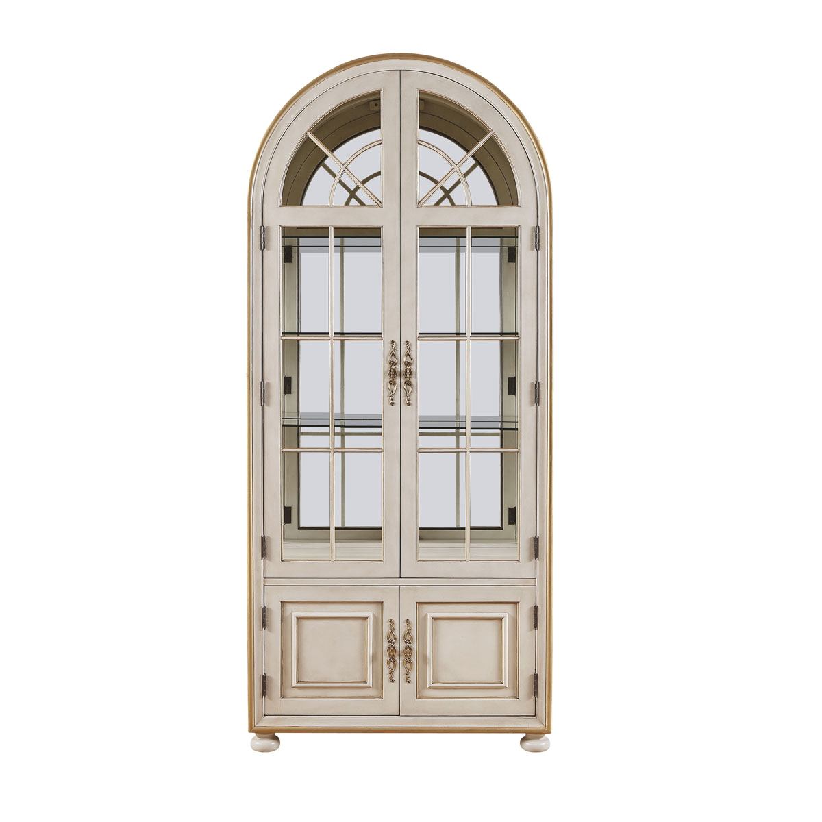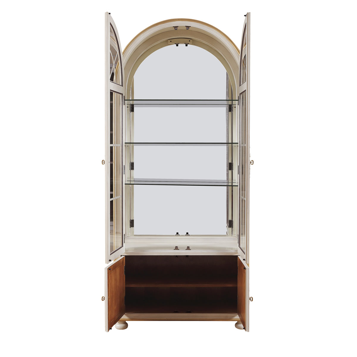* 门内有三块玻璃层板,背板处装有背镜,使柜身内部的光线更通亮; * 下门内有一块可调木制层板;