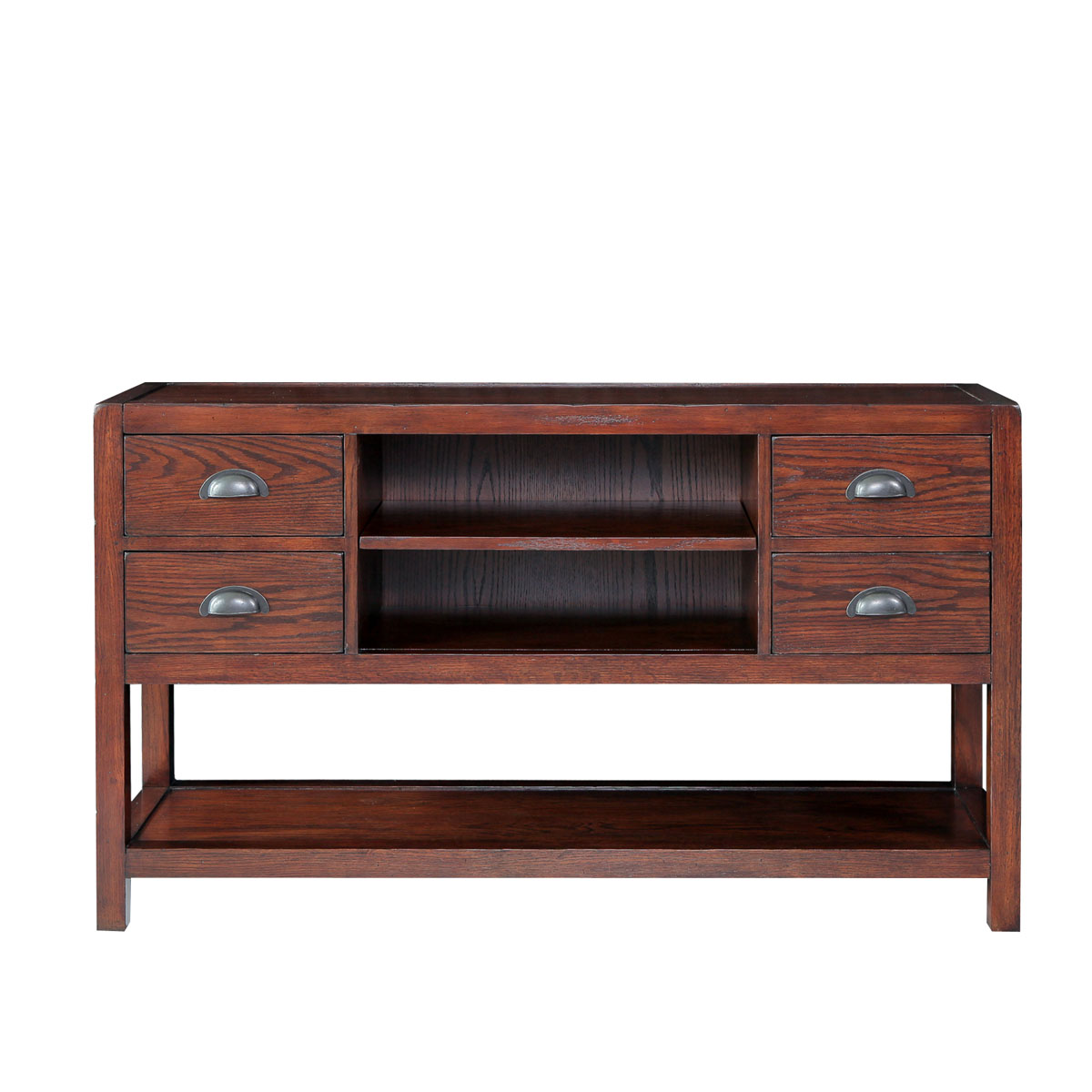 * 四个储物抽斗其底部采用硬木实木滑轨 * 中间有一块木层板, * 底部开空的存放空间,放便存取物品; * 底部装有可调整脚钉;