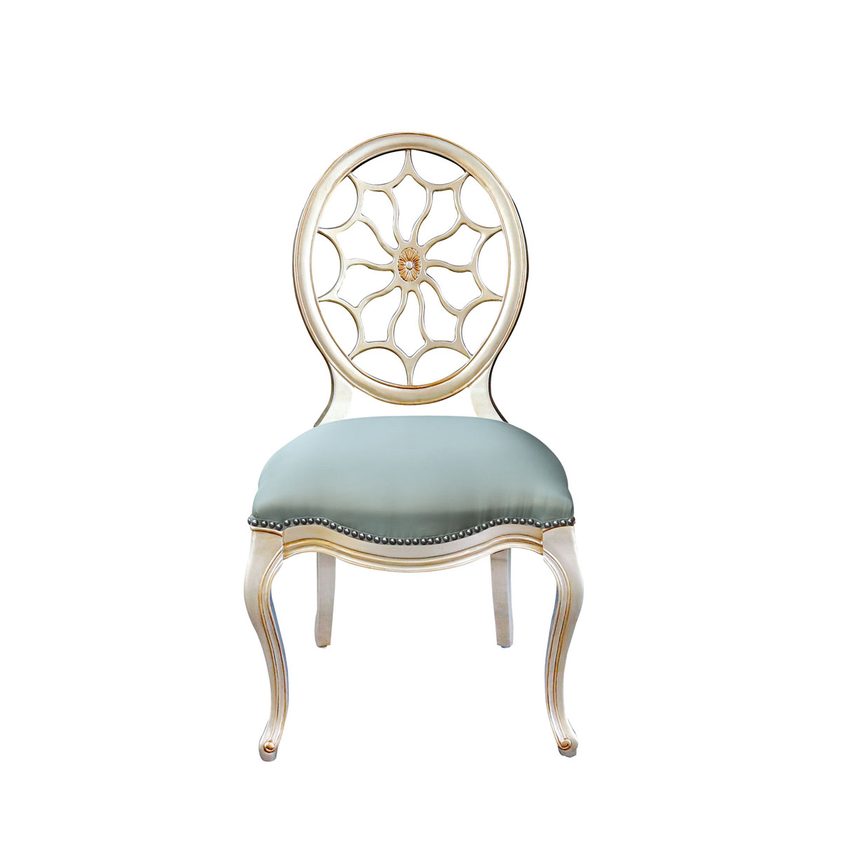 * 参考乔治三世时期的古董造型设计,使用轮子构造椅背和安妮王后腿,配以精致的手工雕刻细节和涂金工艺、浪漫的花形布艺面料和厚实柔软的填充物,是豪华系列凡尔赛玫瑰法式单椅的特色。