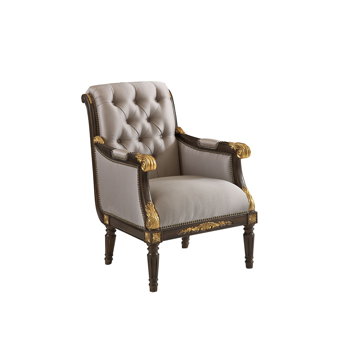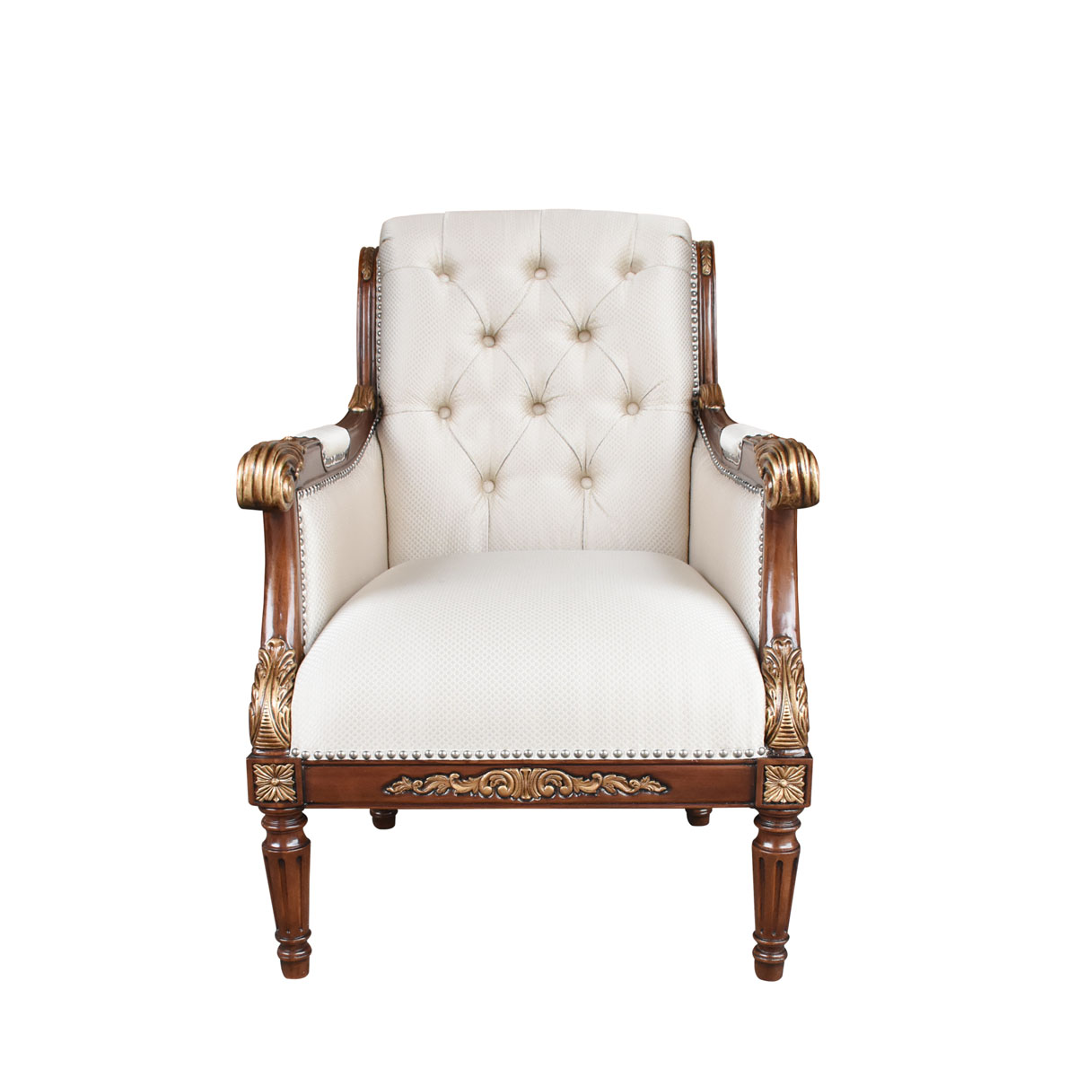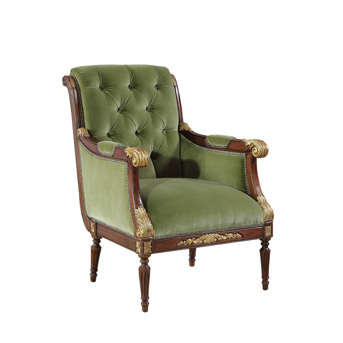 卷叶雕刻的扶手设计、舒适的椅背角度、细致的雕刻和贴金箔工艺。这款休闲椅是QueenVictoria(维多利亚女皇)时期的设计,我们还可以在她晚年的照片中找到它的踪影。并配上触感舒适的布艺和包有丰厚的填充物坐垫和靠背。