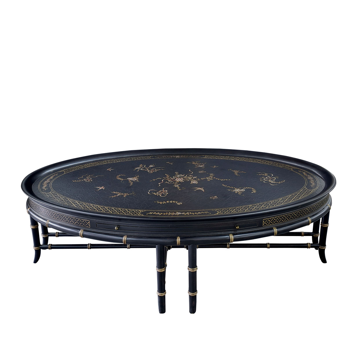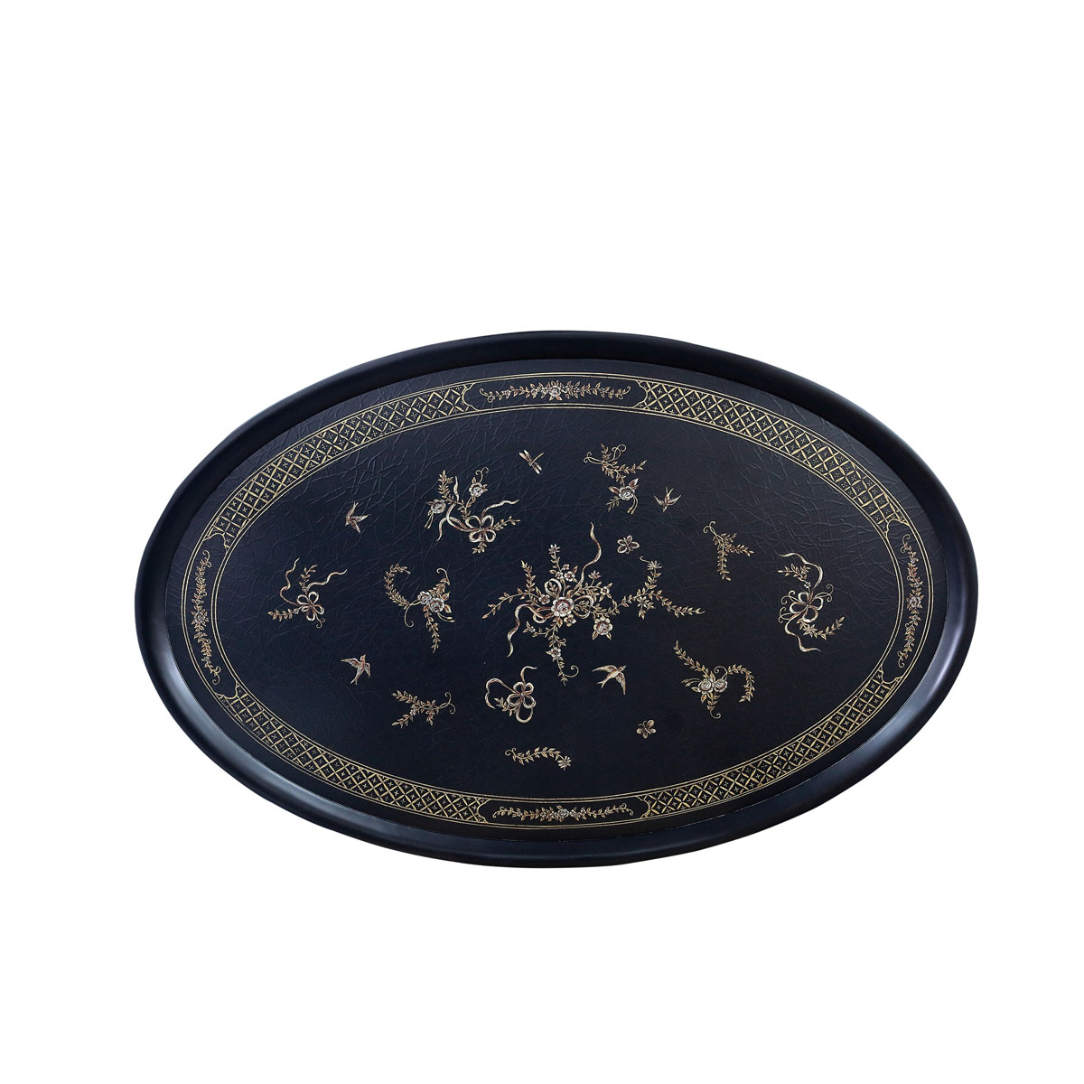 * 精美的手工彩绘图案,来自东方意念的植物图案搭配高贵的黑底金漆;配上托盘式面板设计,是经典系列圆咖啡桌的一大特色。