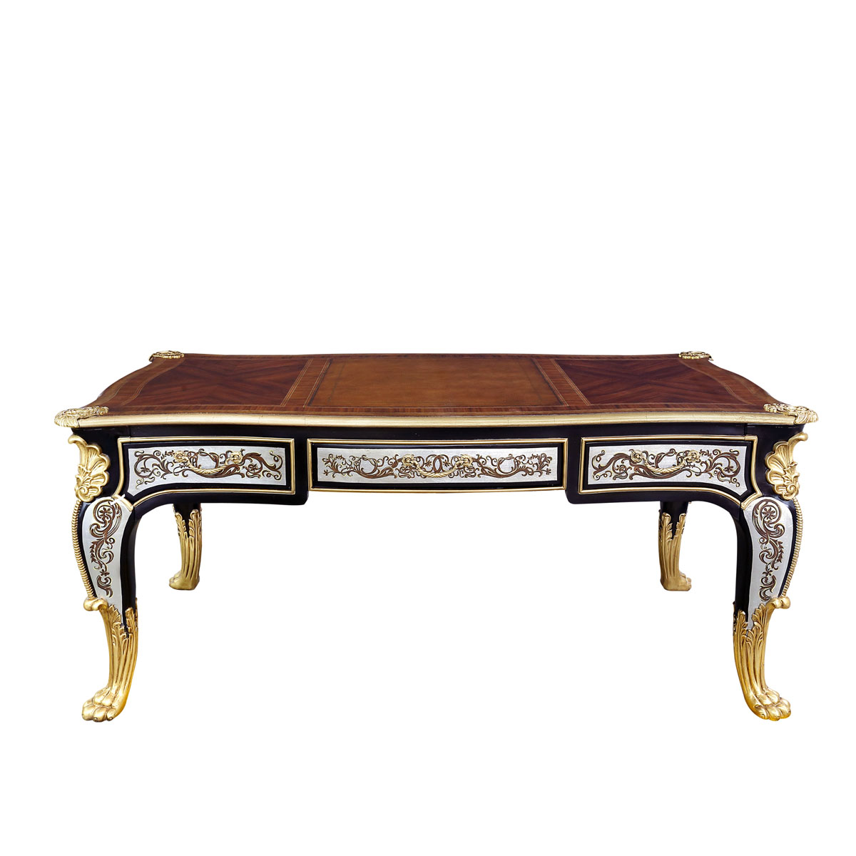 * 经过专业工艺师绘制的图腾手绘 * 三个储物抽斗,底部采用英式经典硬木实木滑轨设计; * 中斗为键盘斗,左右两边为鼠标斗; * 脚底部装有可调脚钉