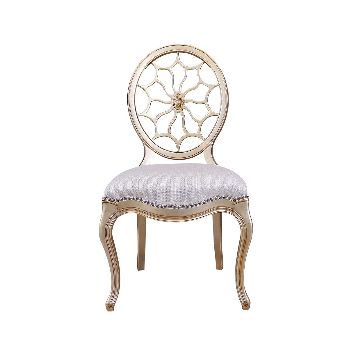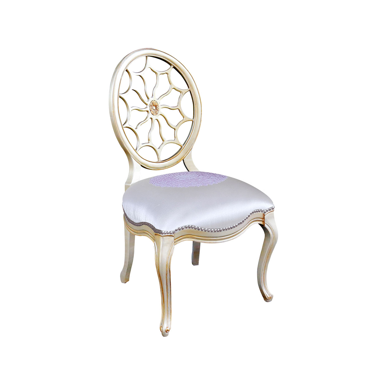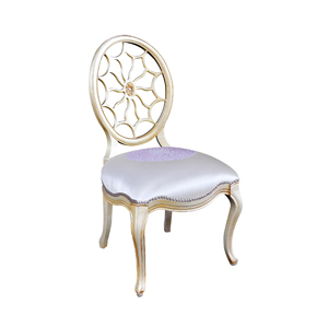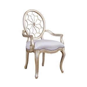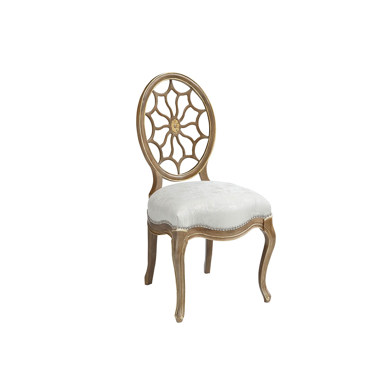 * 参考乔治三世时期的古董造型设计,使用轮子构造椅背和安妮王后腿,配以精致的手工雕刻细节和涂金工艺、布艺面料和厚实柔软的填充物,是豪华系列凡尔赛玫瑰法式单椅的特色。