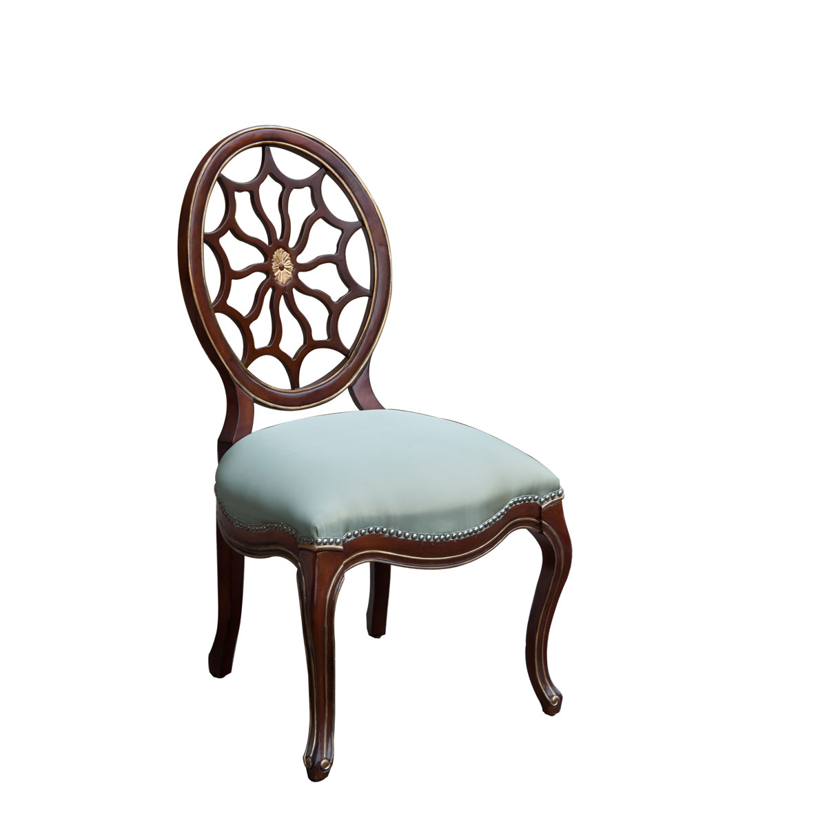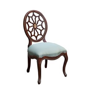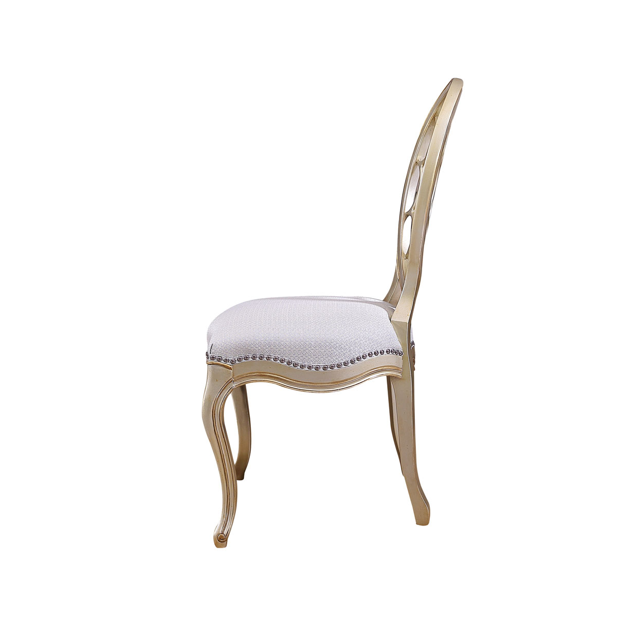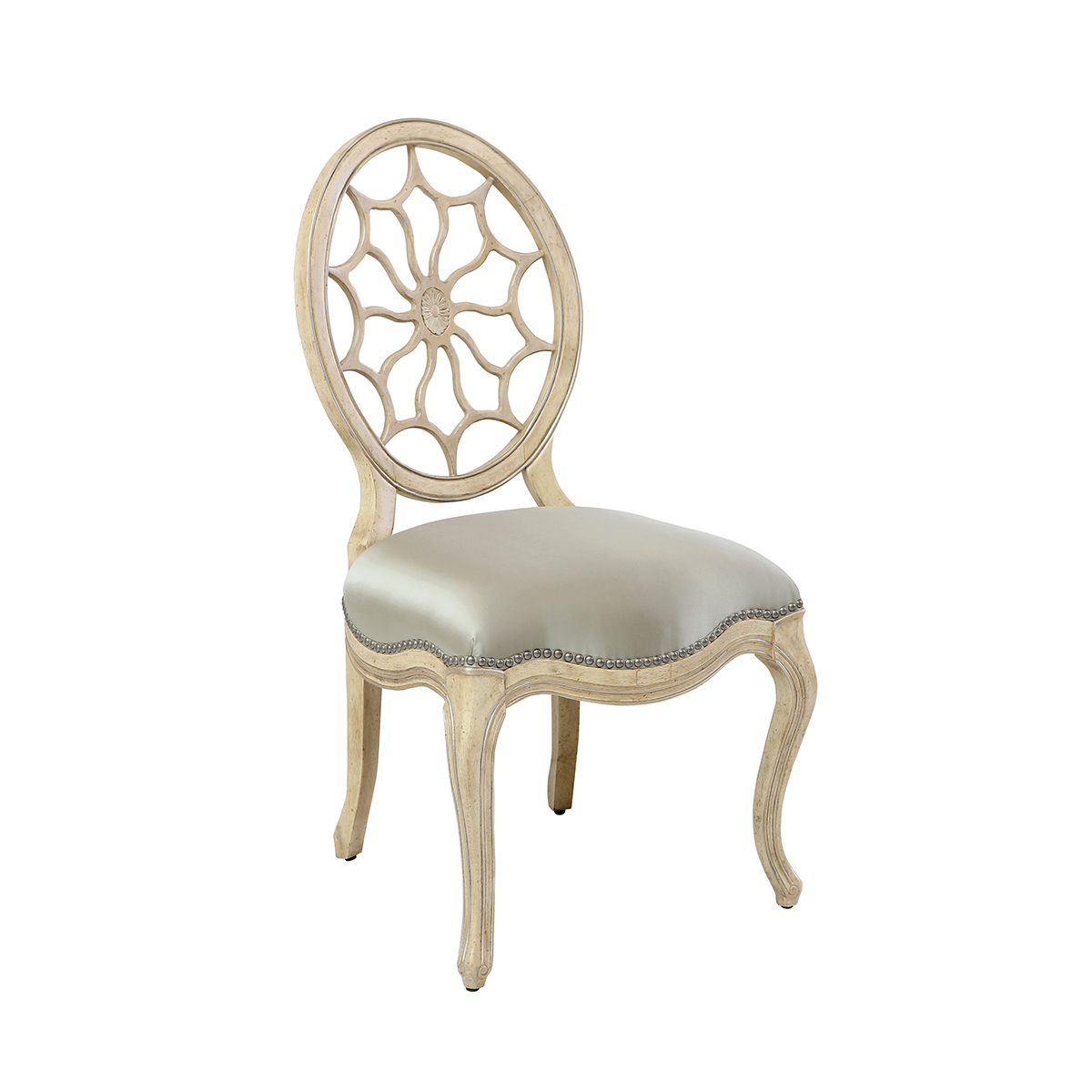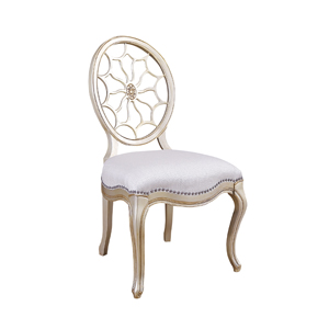 * 参考乔治三世时期的古董造型设计,使用轮子构造椅背和安妮王后腿,配以精致的手工雕刻细节和涂金工艺、布艺面料和厚实柔软的填充物,是豪华系列凡尔赛玫瑰法式单椅的特色。