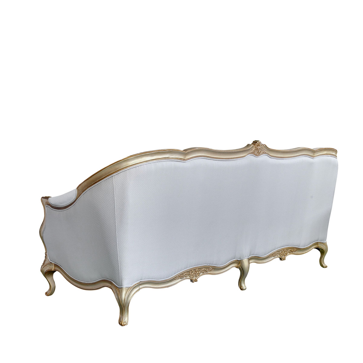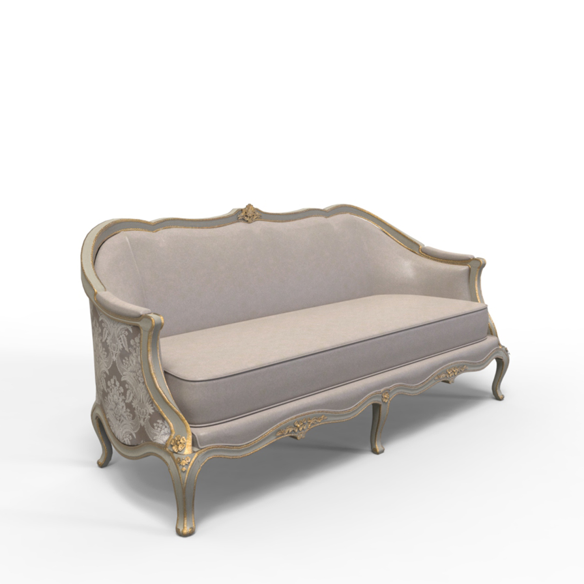* 从法国十八世纪初摄政时期的风格中汲取灵感制作而成,采用了同风格的弯脚设计,阿坎瑟斯叶雕刻造型和金箔贴饰,再饰以繁花绽放图案的丝绸和包有丰厚的填充物坐垫和靠背,使得这款沙发闪耀着华丽高贵的光环。