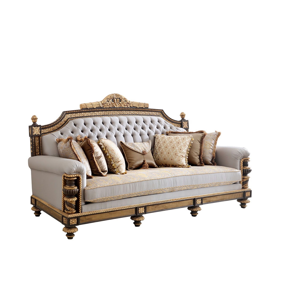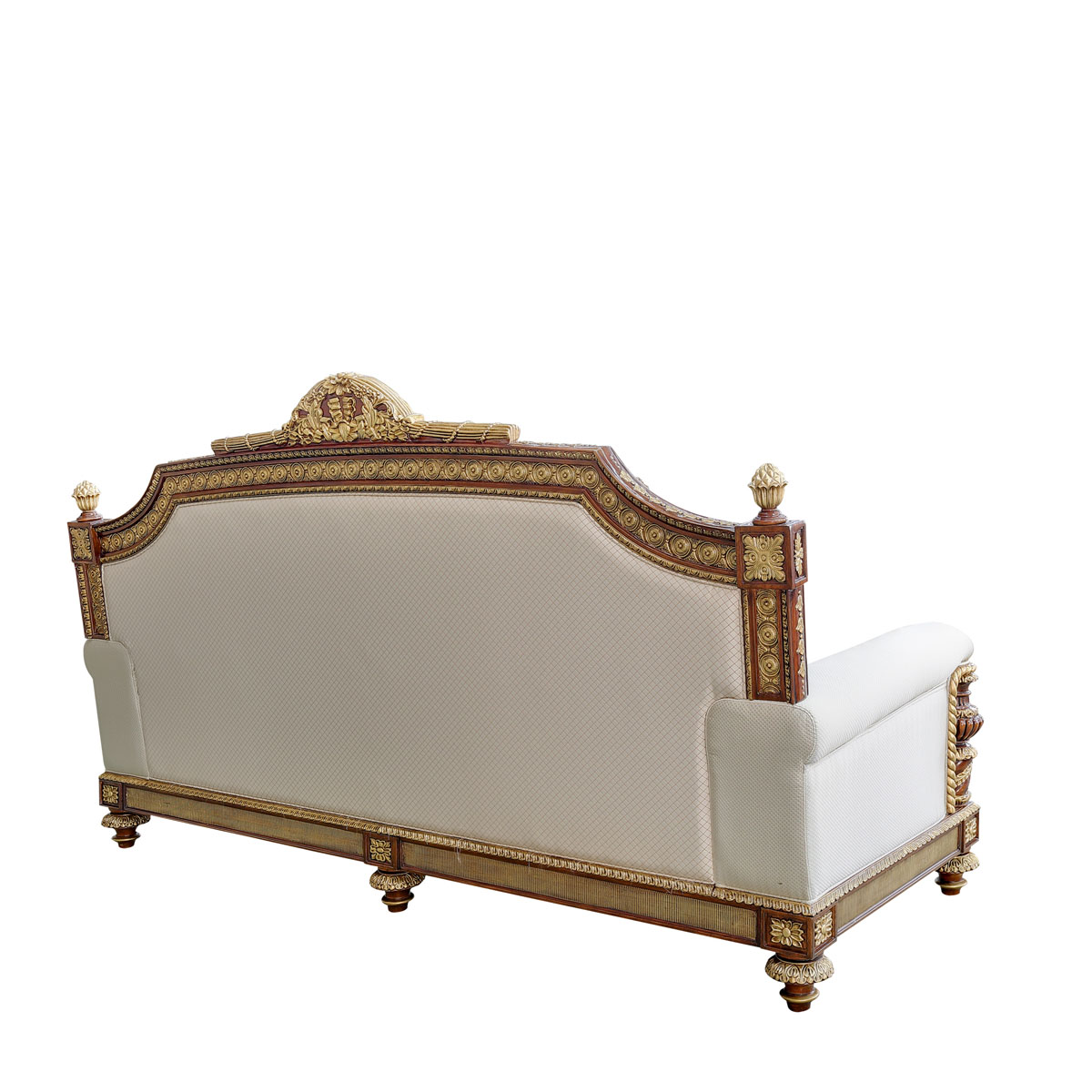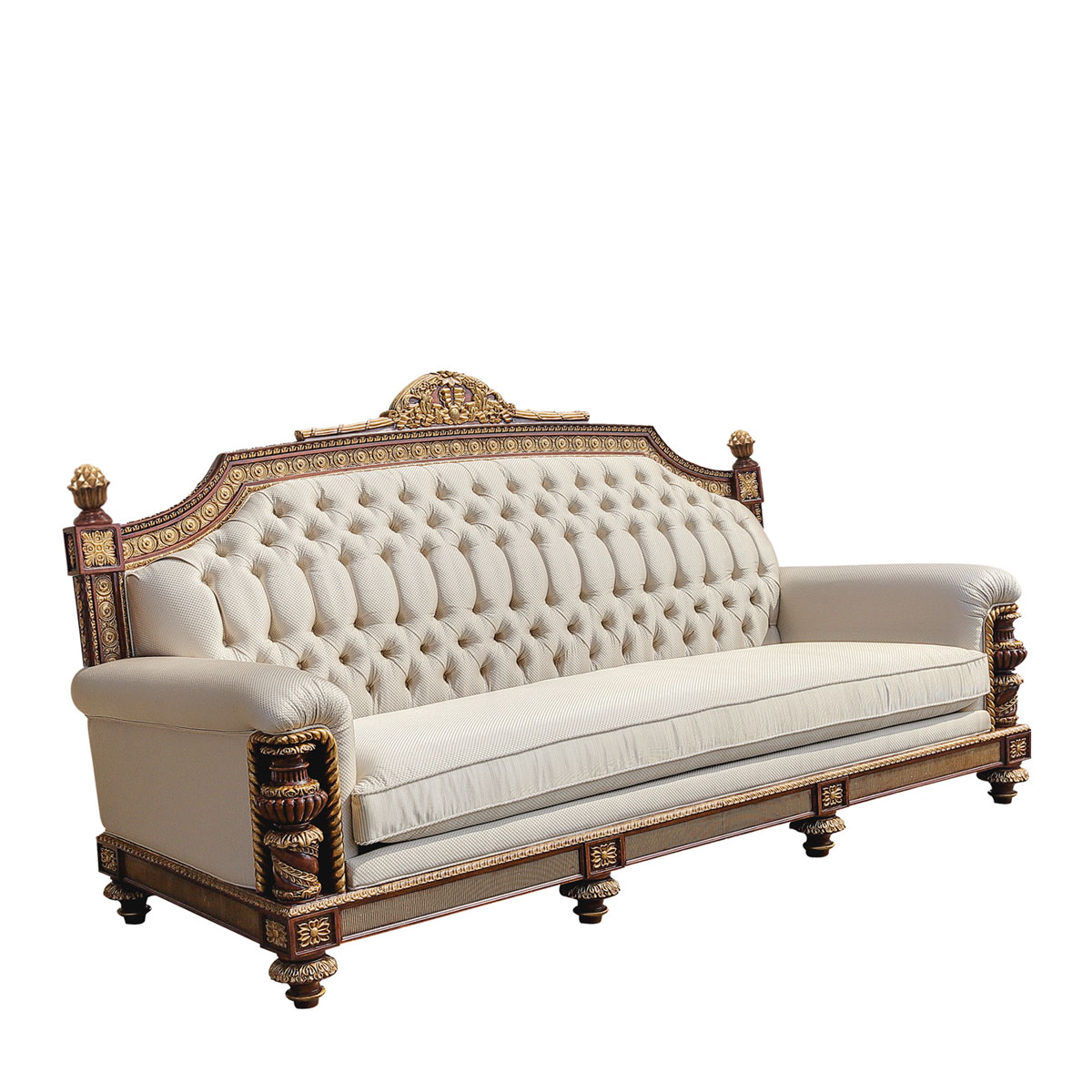 * 以英国温莎城堡中乔治四世时期的卧床为设计意念,使用皇家御用的桃花心木为主要材质,配以精致的雕刻和贴金工艺,表达英国皇室尊贵的地位。同时使用舒适的软包和柔顺的布艺,使艺术和生活结合,表达英国君王客厅应有的品质,是温莎堡系列英式沙发的特色。