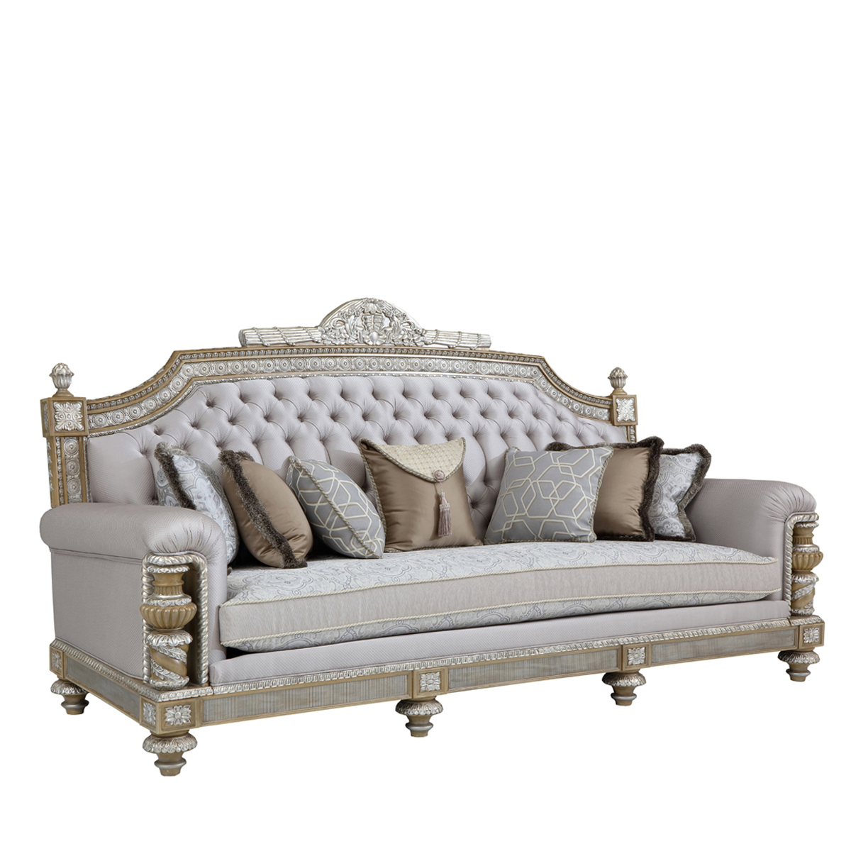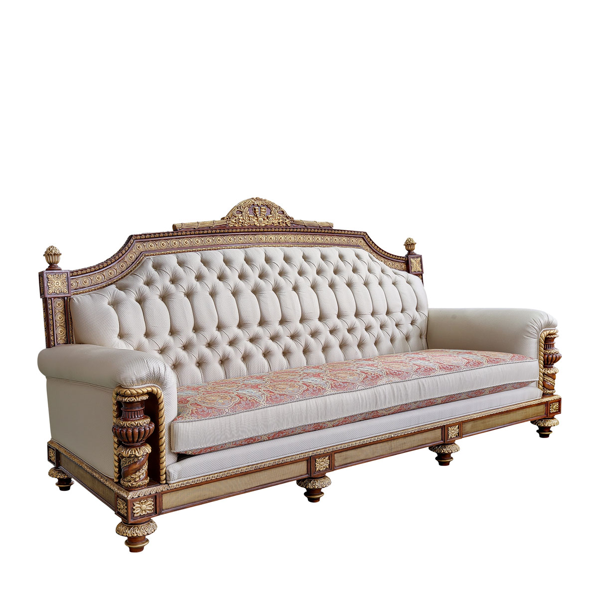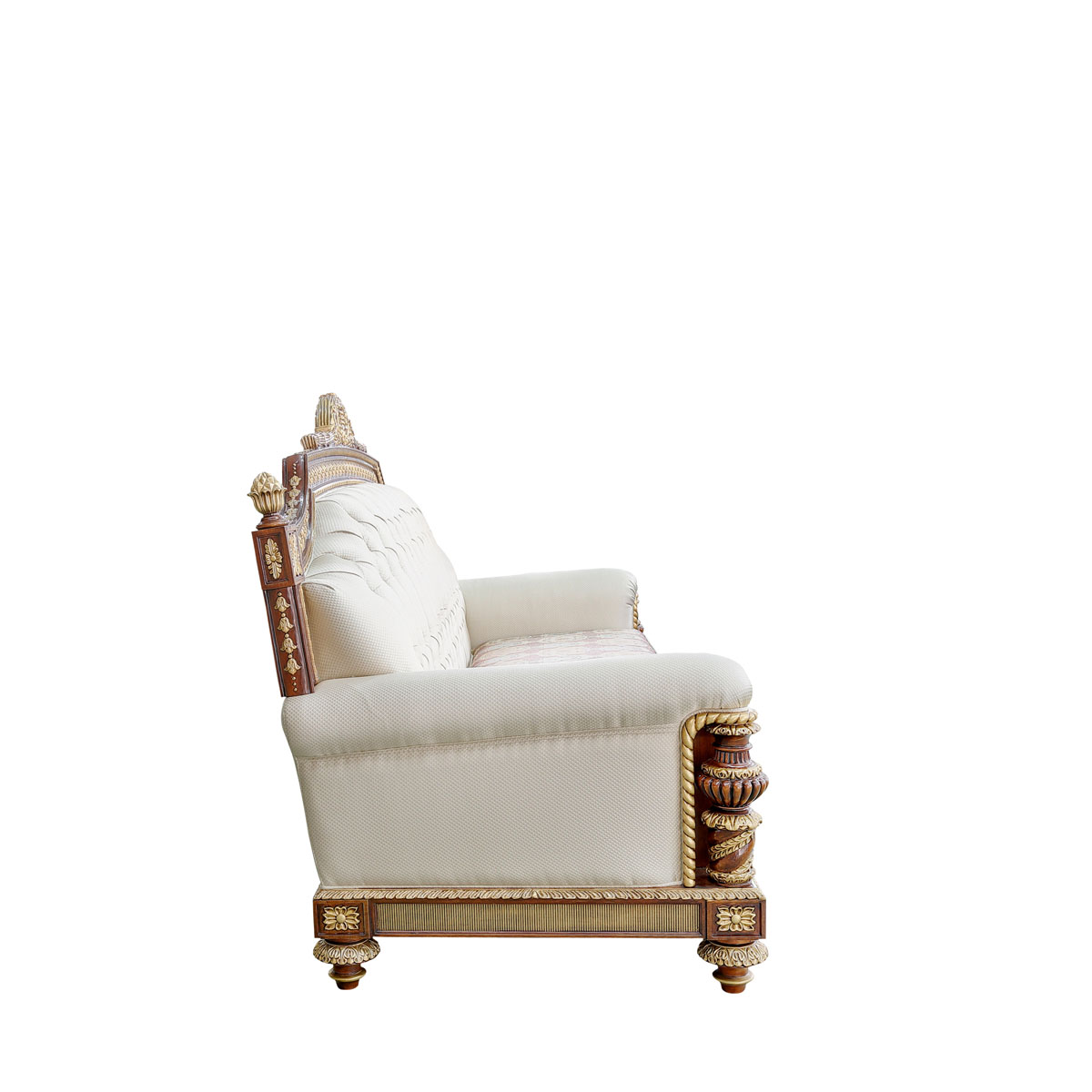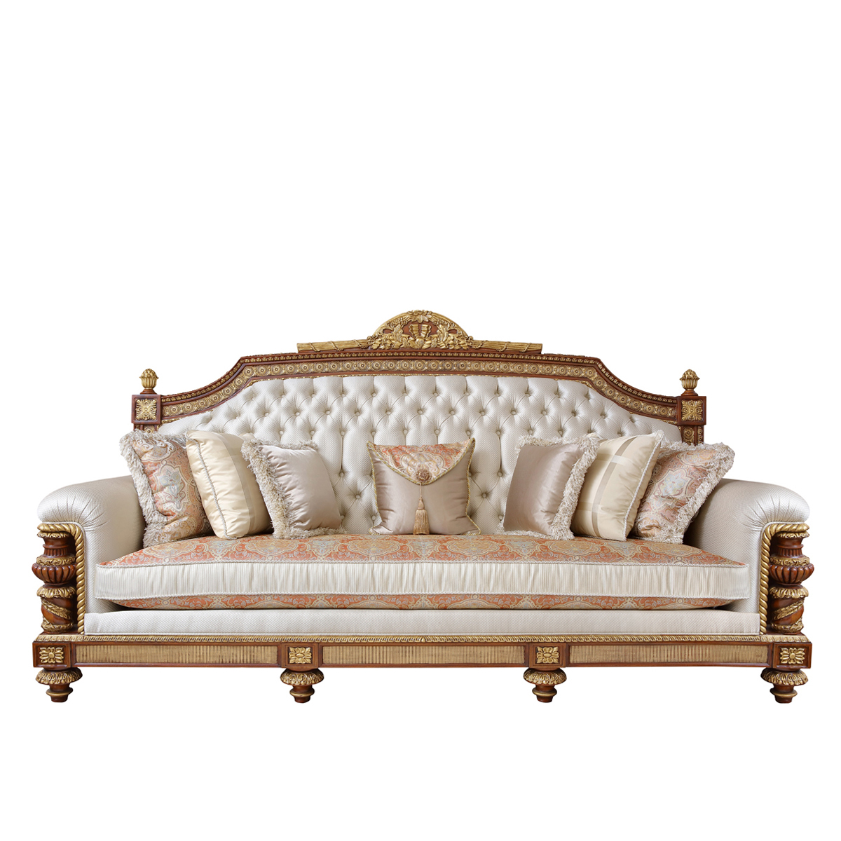 * 以英国温莎城堡中乔治四世时期的卧床为设计意念,使用皇家御用的桃花心木为主要材质,配以精致的雕刻和贴金工艺,表达英国皇室尊贵的地位。同时使用舒适的软包和柔顺的布艺,使艺术和生活结合,表达英国君王客厅应有的品质,是温莎堡系列英式沙发的特色。