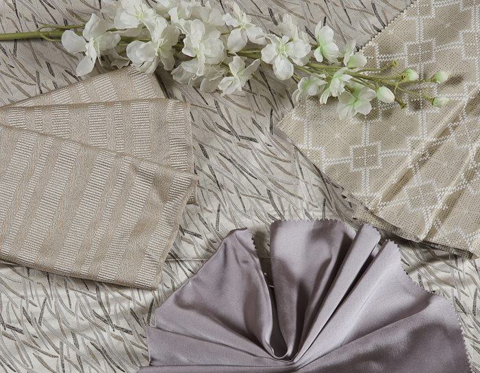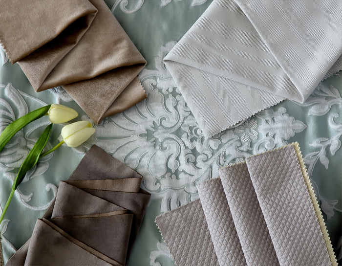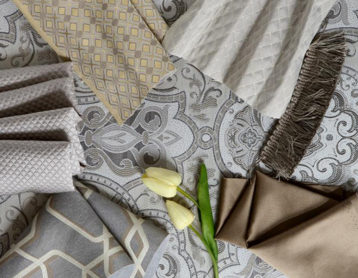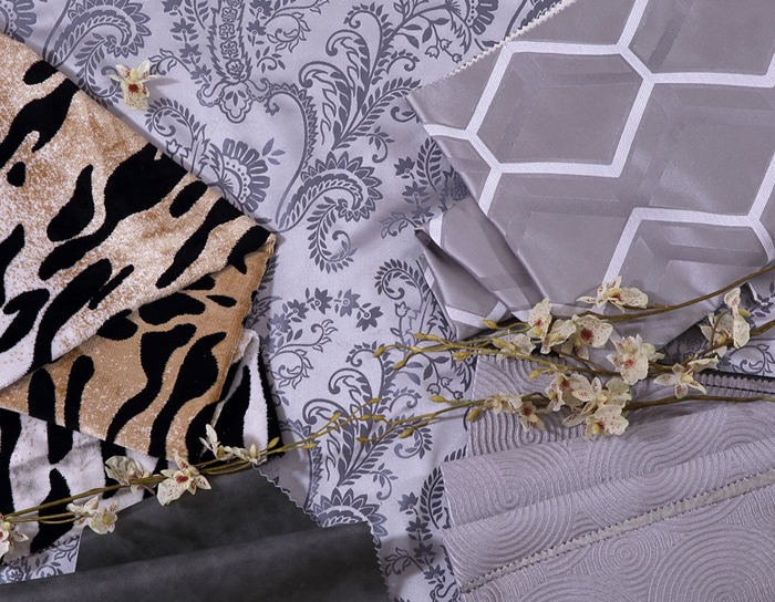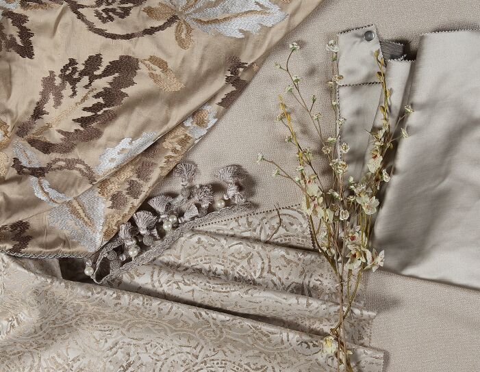 亚麻、丝绸、纯棉等多样的面料材质,层次分明,厚薄相兼。立体布艺和提花刺绣更显轻盈,同时将浓厚的艺术底蕴尽现,在法式灰的映衬下雅致中带着侯爵夫人般的贵气。